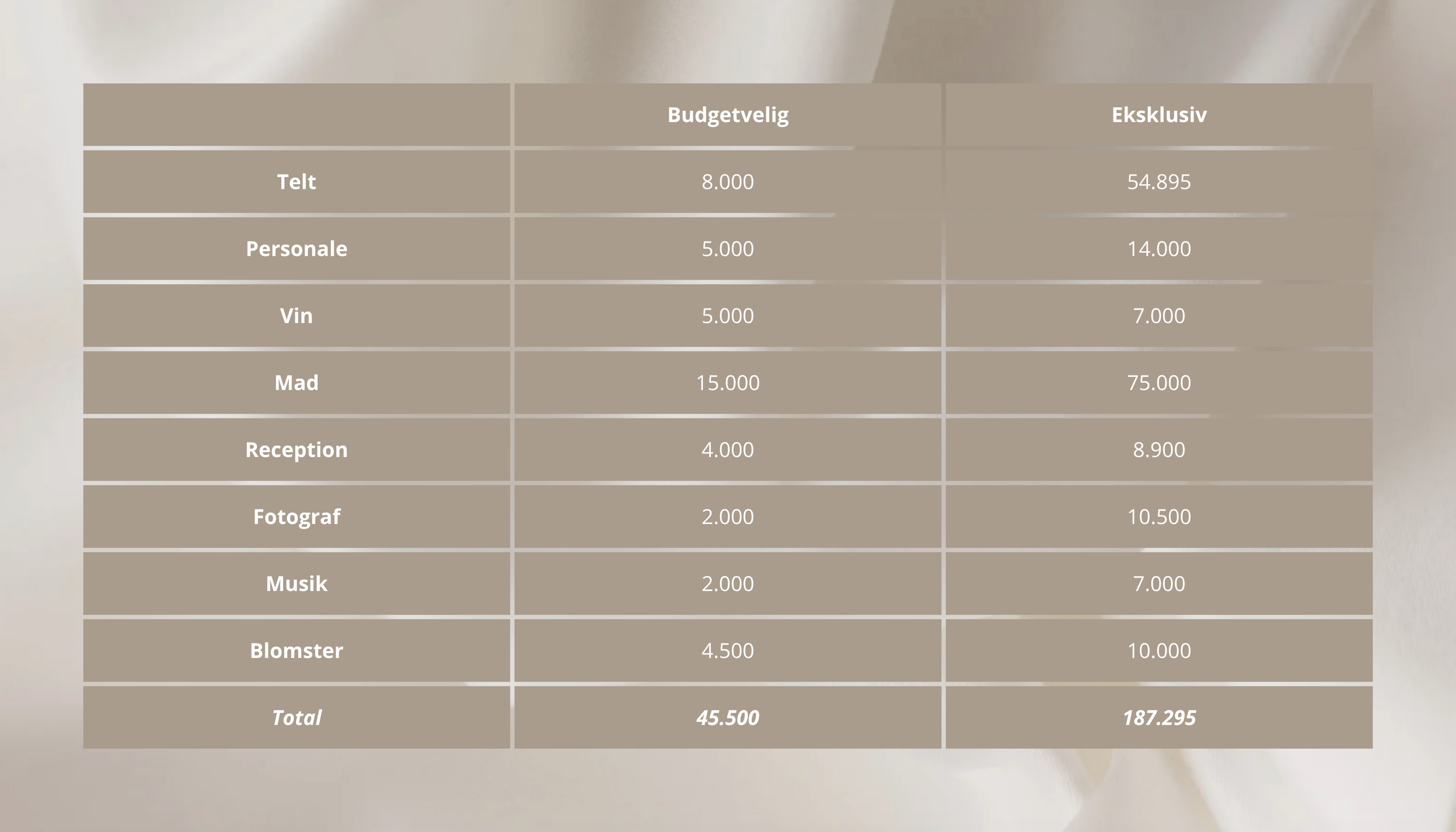 Vi giver jer et realistisk og gennemarbejdet overblik over, hvad der typisk skal til – både i en budgetvenlig version og en mere luksuriøs løsning med ekstra detaljer og wow-effekt.