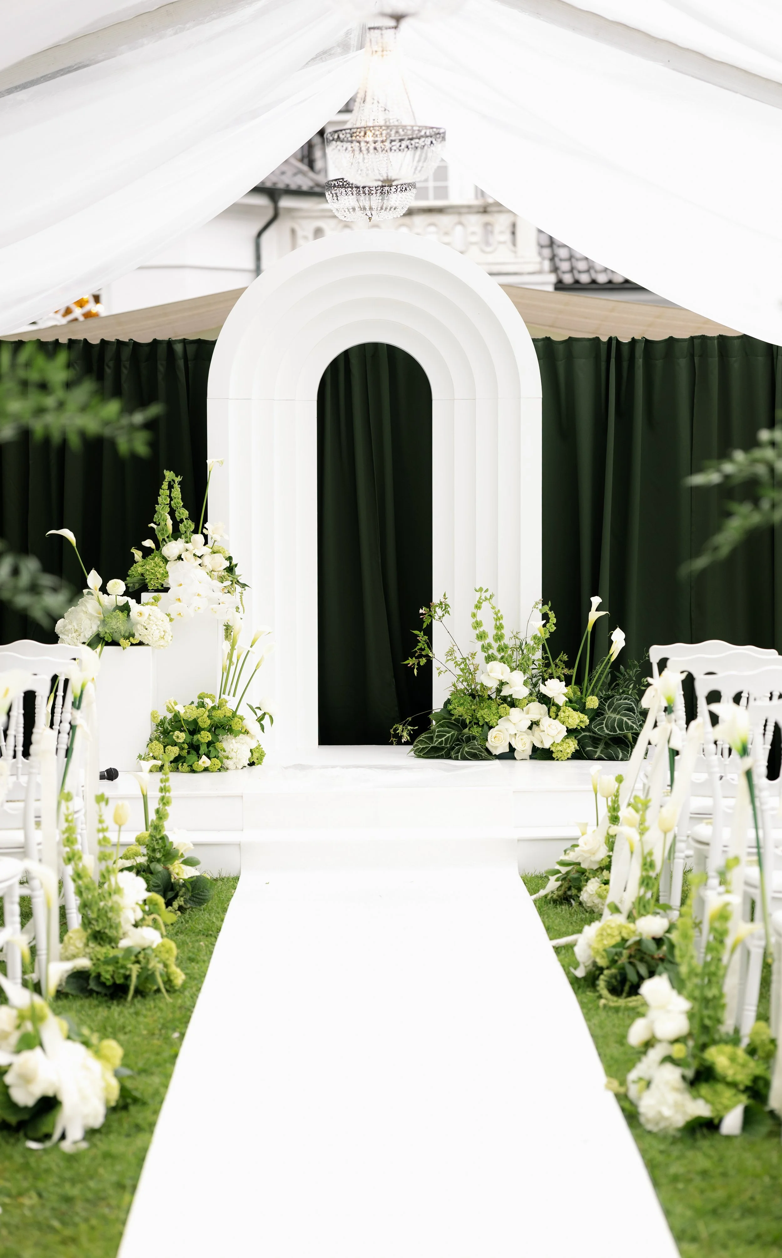 Denne løsning skaber et eksklusivt og sammenhængende udtryk, hvor blomsterne binder hele dagen sammen – fra vielse til middag og fest.